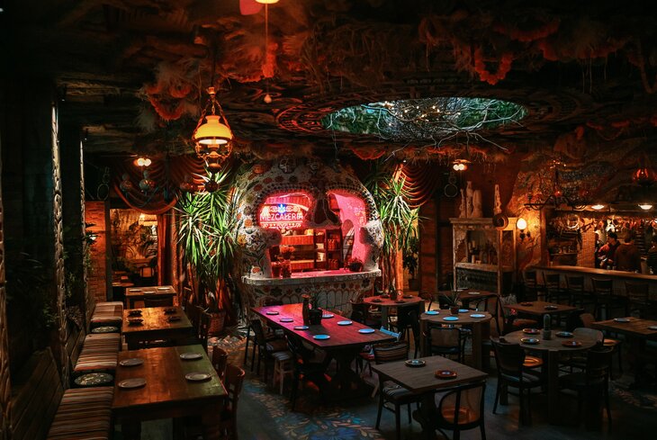 На Остоженке открылся ресторан Arrurru — мексиканский андеграунд с поражающим воображение убранством. В наличии алтари, купол с переплетенными ветками, под ними колыбель и монументальный бар в форме черепа, как будто в фактурном подземелье круглогодично празднуют День мертвых.
