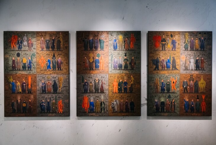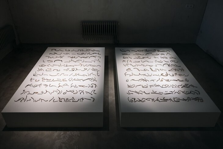 В одной комнате поместили работы Петра Белого и Гриши Брускина. Оба художника размышляют о религии и ошибочных прочтениях священных текстов. Белый собирает «псевдобуквы» из металлических прутьев — знаки похожи на иврит, но это лишь образы, подчеркивающие идею о невозможности точного прочтения. Напротив — холсты Брускина из серии «Алефбет», где изображены заповеди Торы. Чтобы расшифровать их, нужно знать его авторскую систему символов.
