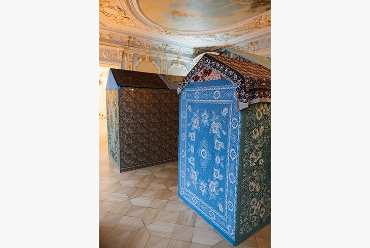 Дальше — комната с фресками ангелов на потолке, посреди которой стоит домик из ковров. Внутрь можно и нужно заходить: там небольшой лабиринт. Художницы Ирина Корина и Ольга Божко отсылают и к коммунальному прошлому усадьбы, и к тем детским шалашам из одеял, в которых всегда чувствовалась безопасность и автономия.