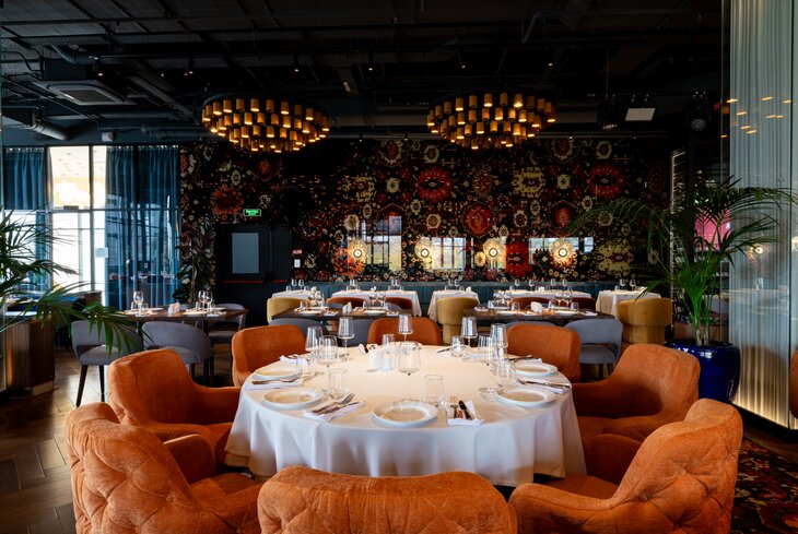 В интерьере восточного ресторана замешали, кажется, все, что можно. Стол разрешается выбрать и около панорамного окна, и на пестром ковре, и возле сцены. Такой же микс и в меню — в нем соединили традиции Грузии, Азербайджана и Турции. Получили большой набор хачапури (от 759 рублей), пиде (от 759 рублей) и кутабов (от 572 рублей), а еще хинкали (от 122 рублей) и шашлыка (от 1 210 рублей).