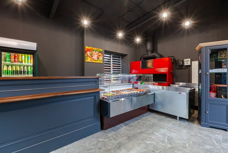Шашлычная со всеми присущими ей атрибутами: небольшим помещением, витриной с шампурами и длинным мангалом. Выбирайте люля-кебаб из курицы (300 рублей), свиной стейк (400 рублей), бараньи ребра (600 рублей) или запеченные шампиньоны (250 рублей). Ставку здесь сделали на еду навынос, поэтому для обеда внутри предусмотрели только один высокий стол.