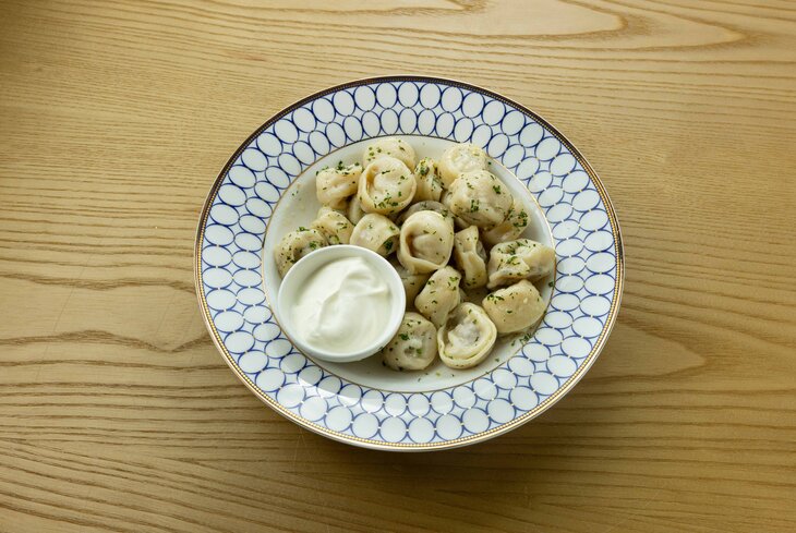 В этот ресторан однозначно стоит идти за классикой. В тесто заворачивают фарш из мяса свинины и говядины с луком. Подача тоже консервативная — со сметаной и свежей зеленью.