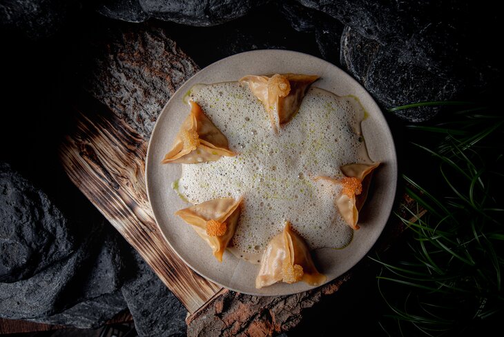Сначала пельмени с нельмой и чавычей томят в чугунке с соусом берблан на основе лука-шалота, заправкой из одуванчиков и маслом черемши. Подают довольно необычно — с пеной из сливочного соуса и щучьей икрой.