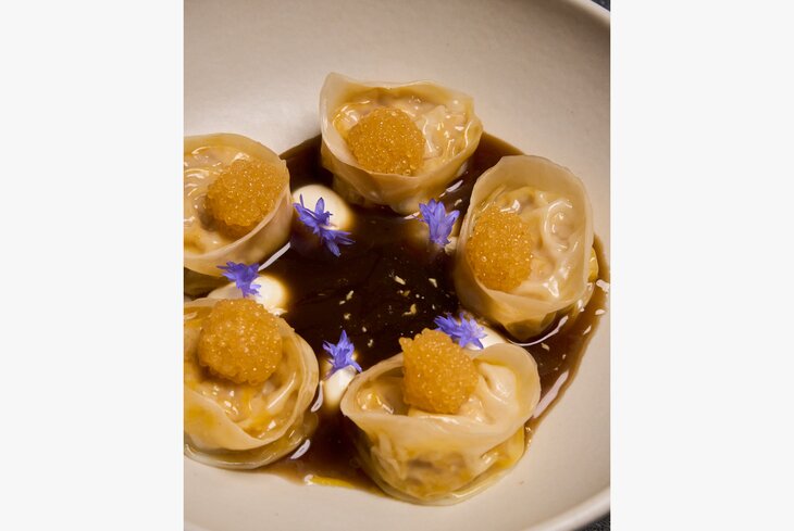 Бренд-шеф ресторана Сергей Балашов придумал начинять гёдза сибасом и креветкой. С кухни их приносят в соусе том-ям. Для яркого акцента добавляют ароматную кинзу и перец чили.