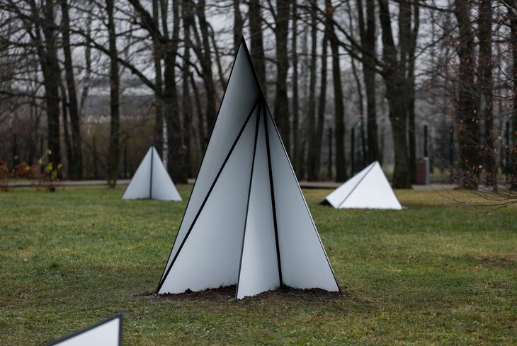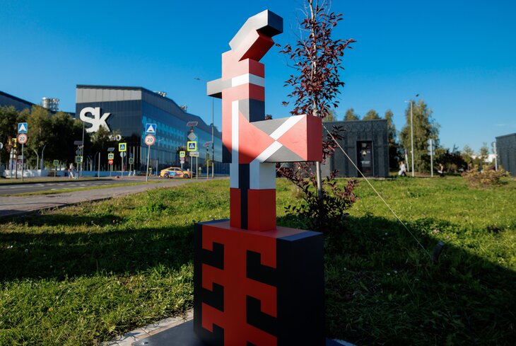 Эта работа художника Антона Смита из ЮАР расположилась перед Сколковским институтом науки и технологий. «Маска» из металла и стекловолокна — настоящий обман зрения для зрителей: кажется, что ее элементы то отдаляются друг от друга, то стремятся воссоединиться.