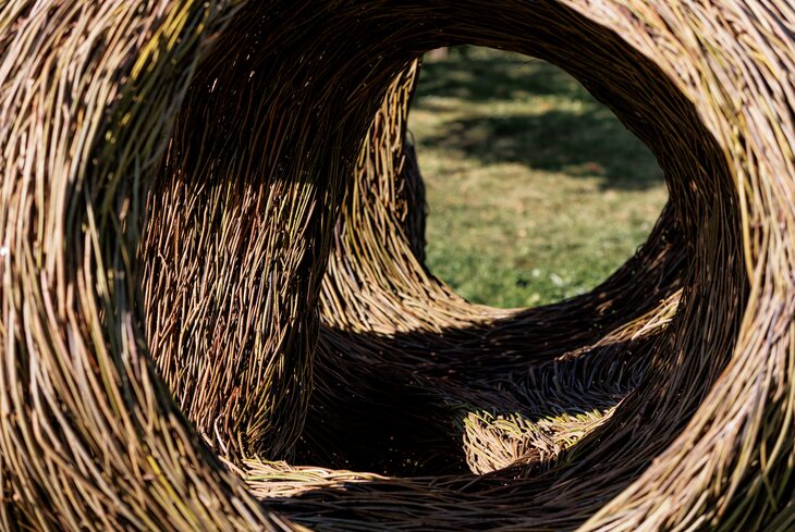 В Саду Технопарка напротив Международной гимназии «Сколково» белорусские скульпторы Полина Пирогова и Василий Тимашов из мастерской «Эхо» возвели «Лунную долину» — интерактивную скульптуру из лозы, похожую на кратеры или спутники. Так и манит взобраться на самый верх!