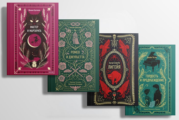 Тут решили не мелочиться и положили в один футляр сразу четыре подарочных книги в элегантном оформлении. Внутри найдете «Мастера и Маргариту», «Гордость и предубеждение», «Лигейю» и «Ромео и Джульетту».
