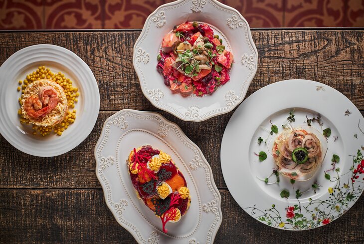 В преддверии Нового года в московских ресторанах решили не ограничиваться стандартным набором из оливье и селедки под шубой. Где-то их модифицировали, а где-то разнообразили другими неожиданными сочетаниями. Собрали 14 спешел-меню.