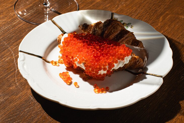 Открывшийся этим летом ресторан встречает свой первый праздничный сезон. И почти во все блюда здесь кладут икру. Главный зимний деликатес добавляют к риету из лосося (1 200 рублей), картофелю фри со сметанным кремом (1 600 рублей) и пасте (3 100 рублей).
