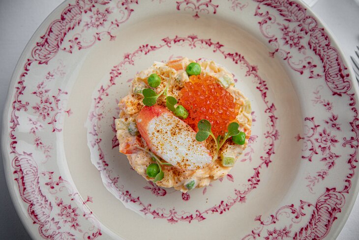 В камерном бистро на Покровке всего один праздничный спешел, зато самый что ни на есть новогодний. Здесь переосмыслили классический оливье и добавили к нему азиатские мотивы. Получился салат с сахалинским крабом и домашней красной икрой (1 350 рублей).