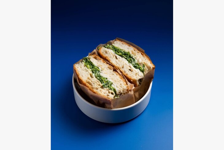 Дальше двигаемся в сторону парка «Красная Пресня» и находим там отдельное круглое здание — в нем кофейня. Заказывайте сэндвич с моцареллой и песто (850 рублей) и какао с малиной (550 рублей).