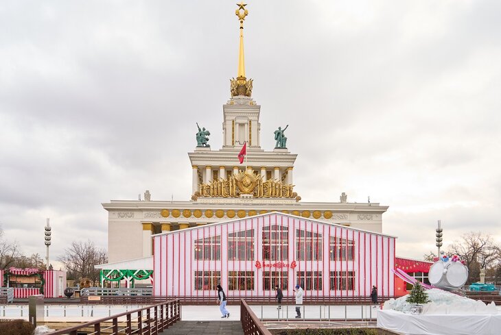 Дальше двигаемся на главный каток города между павильонами № 1 «Центральный» и № 58 «Земледелие». Скользить по льду будете рядом с фонтанами «Дружба народов» и «Каменный цветок». Если не очень уверенно стоите на коньках, то тут есть спокойная зона с высокими бортиками. Билеты от 500 рублей.