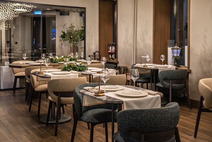 Интерьер максимально нейтральный и, кажется, вообще остался от предыдущего ресторана, но это как раз характерно для шефских ресторанов в Европе, где ничего не должно отвлекать от тарелки. А на ней шеф экспериментирует с деликатесами со всего мира, вплетая их в канву итальянских рецептур: авторский севиче из тунца с бобами и авокадо — соединение перуанских техник и итальянской заправки (2 600 рублей), в ризотто с цветами шафрана и перепелкой (2 100 рублей) есть отголоски пряностей Марокко, томленые щечки подают с соусом из порто, кофе и сморчками (2 300 рублей), а сладость карпаччо из красной сицилийской креветки подчеркнута страчателлой и спелой малиной (3 500 рублей).