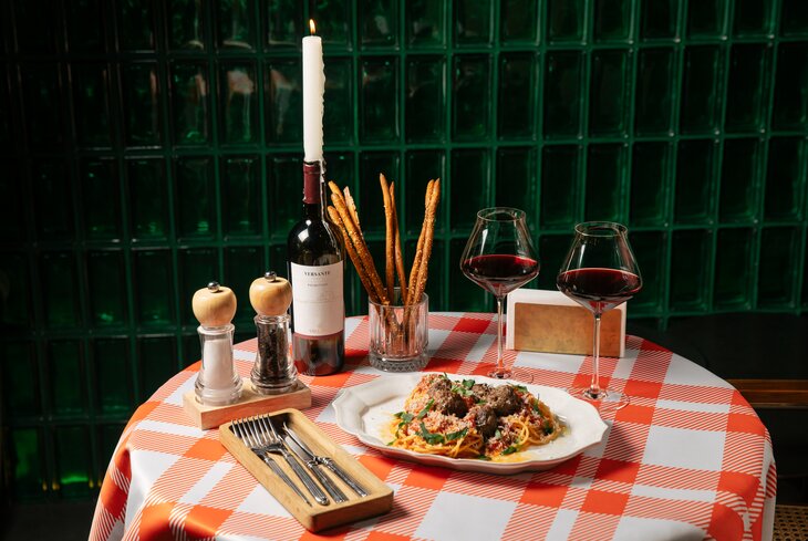 В двухэтажном особняке вдохновились диснеевским мультфильмом «Леди и бродяга» и придумали два сета по мотивам анимации (2 800 рублей). Принесут, конечно же, рассчитанную на двоих огромную порцию спагетти с фрикадельками, игристое или коктейль с гранатом и маракуйей.