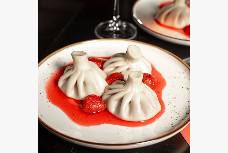 До конца недели в ресторане готовят специальный сет для пар за 1 500 рублей. Все в духе Грузии: розовое вино и хинкали, которые начиняют клубникой и творожным сыром.