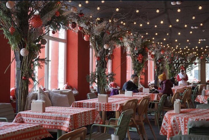 Еду шеф-повара Владимира Жбанникова хочется назвать не комфортной, а душевной, сделанной с заботой обогреть и сытно накормить: пухлые сырники с вареньем (650 рублей), куриный шницель-гигант с сыром и шампиньонами (950 рублей), картошка с лососем из печи (1 150 рублей) и, конечно, оливье — с уткой (800 рублей) и лососем (950 рублей). Гордость ресторана — ягодный пунш, который аппетитно булькает перед входом в медном котле, добавляя новогодним декорациям аромат рождественской ярмарки.