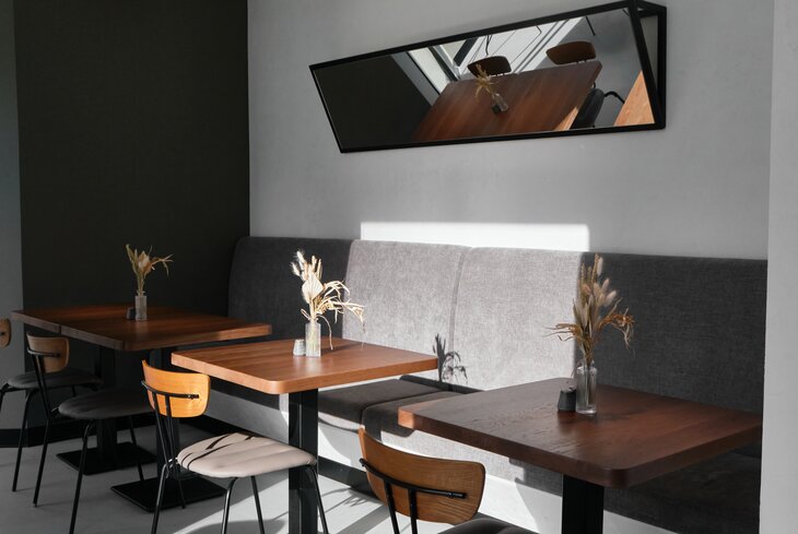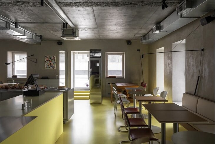 Подчеркнуто простой и функциональный интерьер, в котором особенно выделяется желтый пол и такая же барная стойка. В отличие от второй точки сети на улице Чаянова, здесь есть пекарня. Помимо выпечки, весь день готовят завтраки: в меню — оладьи с кленовым сиропом (620 рублей), гречка на кокосовом молоке (420 рублей) и сырники с вареньем (480 рублей).