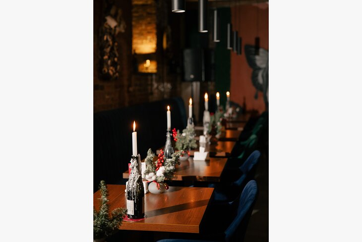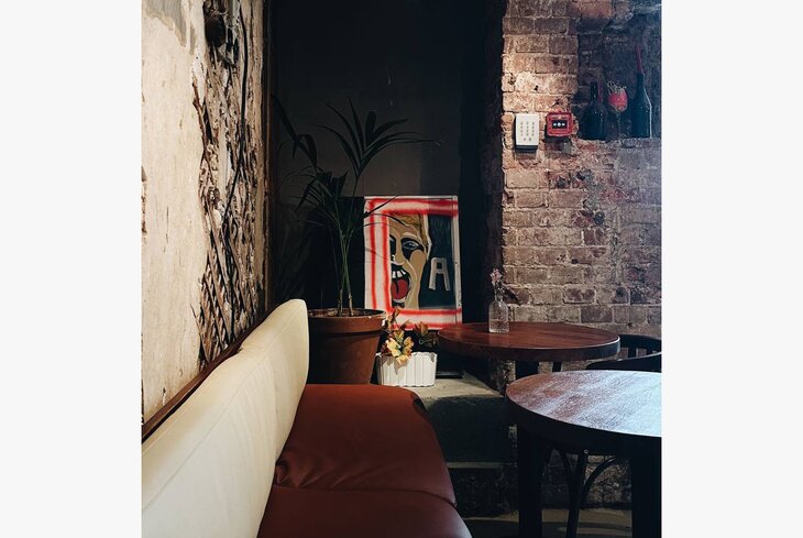 Бар не сразу заметен с улицы: достаточно только свернуть в проулок — и увидите козырек с лестницей вниз на цокольный этаж. Внутри, как и положено бару, темно и камерно. Из источников света тут только свечи и пара неоновых вывесок. А вот меню не только барное: согревайтесь грибным крем-супом (650 рублей), томлеными щечками (1 100 рублей) и салатом с уткой и грушей (710 рублей).