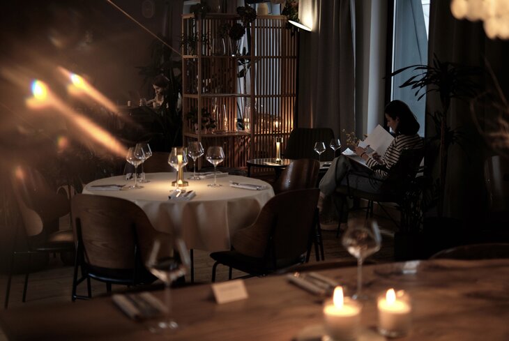 Внутри очень просторно, светло и минималистично. Столики расположены далеко друг от друга, так что в тарелку к вам точно никто не заглянет. В меню рядом с изысканным стейком из лосося (1 390 рублей) и говяжьими медальонами (1 690 рублей) — бутер с красной икрой и взбитым маслом (890 рублей) и сэндвич с тунцом на фокачче (790 рублей).
