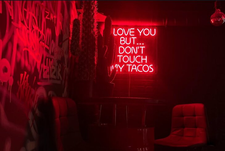 За входной дверью — красно-черный двухэтажный зал. Оформление создавали вместе с уличными художниками, поэтому тут повсюду неон, огромные кактусы и расписанные баллончиками стены. На нижнем уровне — круглые столики-бочки для двух-трех человек, на втором — мягкие диваны и кресла для компаний побольше. Заказывайте буррито с фалафелем (390 рублей), тако с тофу (410 рублей) и чили-начос с гуакамоле (499 рублей).