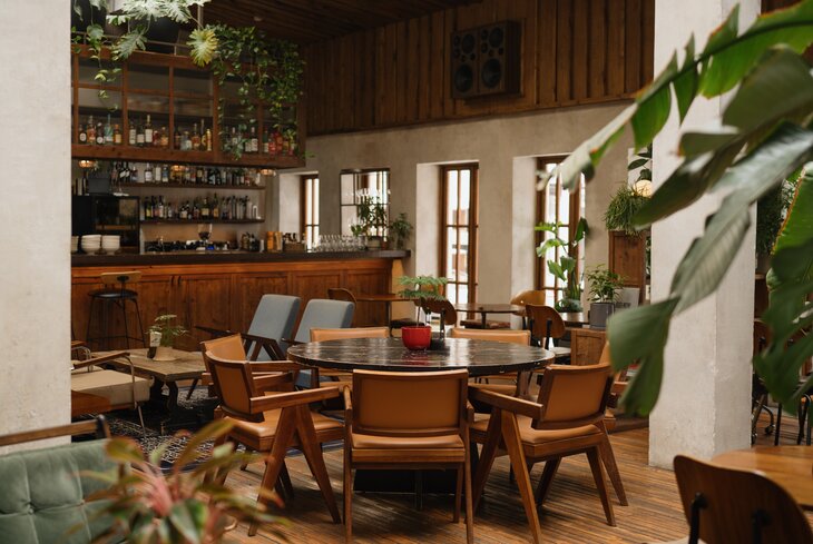 Ресторан-оранжерея на территории пространства «Суперметалл». Внутри — зал в бетоне и дереве, полный зелени и старинных вещиц. При этом ощущения дешевизны нет — наоборот, все смотрится органично. В меню сочетают привычный комфорт-фуд с паназиатскими акцентами. Попробуйте равиоли с креветками и соусом биск (1 250 рублей), суп лакса с курицей (800 рублей) и собу с говядиной (1 050 рублей).