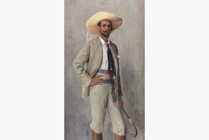 Николай Богданов-Бельский неоднократно писал представителей семьи Горчаковых. На этом портрете князь изображен в костюме «колониального стиля»: светлые ткани, сапоги, шляпа с москитной сеткой. Такой гардероб выбирали для путешествий в экзотические страны — сам Горчаков дважды бывал на охоте в Африке. Внимание привлекают детали: галстук, яркий пояс и трость, которые одновременно указывают на «охотничий» характер костюма и подчеркивают элегантность светлейшего князя.