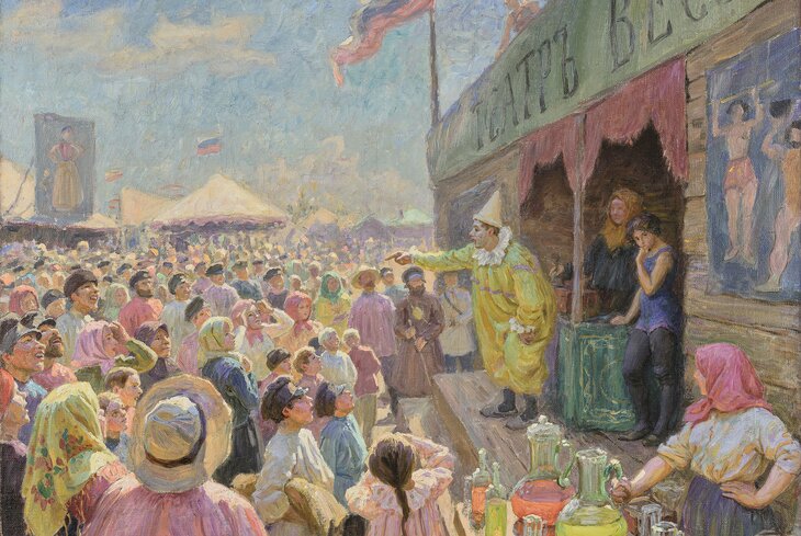 На выставке собраны картины не только о балах, но и о маскарадах и ярмарках. Полотно Федора Рерберга иллюстрирует атмосферу народного театра с паяцем и гимнасткой. Художник, выпускник Петербургской академии художеств и популярный мастер московской школы, много путешествовал по России и Европе, побывал на Кавказе, в Крыму и волжских городах. Возможно, сюжет связан с ярмаркой в Нижнем Новгороде или Казани — о последней в мемуарах упоминал Федор Шаляпин, вспоминая балаганщика и зазывалу Якова Мамонова, который пробудил в певце «тяготение к жизни артиста».