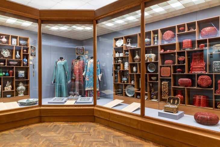 Отдельные разделы посвящены фарфору династий Мин и Цин, классической живописи и каллиграфии, официальному китайскому костюму, лаку, эмалям и декоративному искусству. Здесь можно увидеть все — от свитков старых мастеров до изящных табакерок и парадных халатов чиновников.