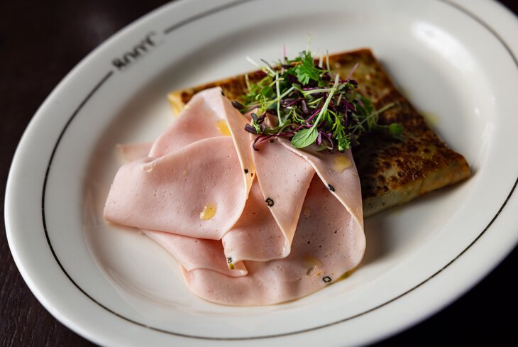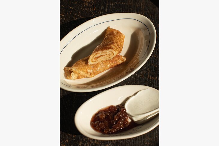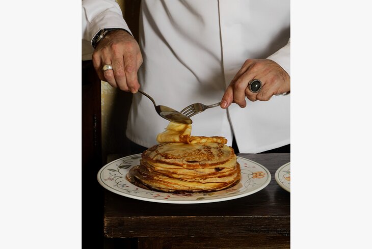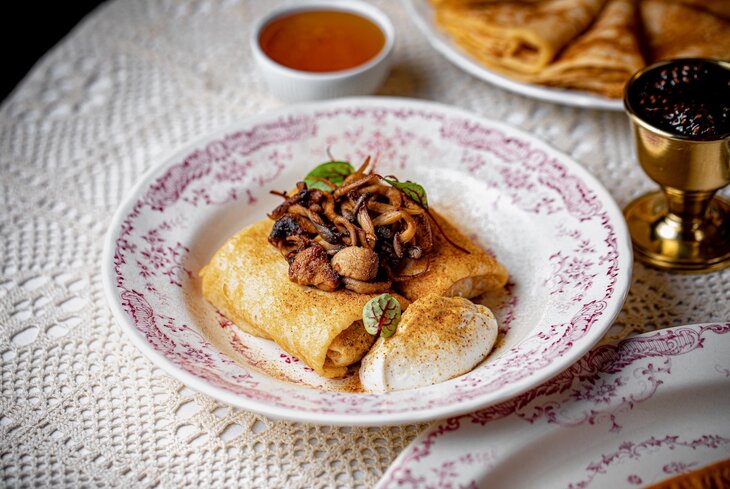 В ресторане в Хамовниках изобрели итальянскую версию — с сыром и мортаделлой (900 рублей), японскую — с угрем и трюфелем (1 400 рублей). Еще одна сытная позиция — со рваной говядиной (900 рублей). А в числе сладких вариантов — блинный торт с вишней (900 рублей) и налистники со сливовым вареньем (900 рублей).
