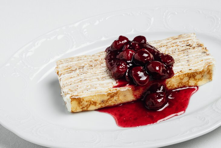 Еще есть десертные налистники с творогом и апельсиновыми цукатами (720 рублей) и блины с крем-чизом, белым шоколадом и вишней (640 рублей).