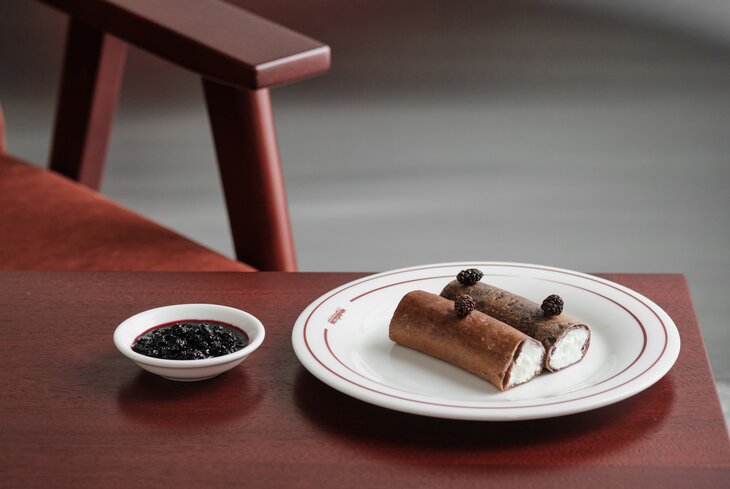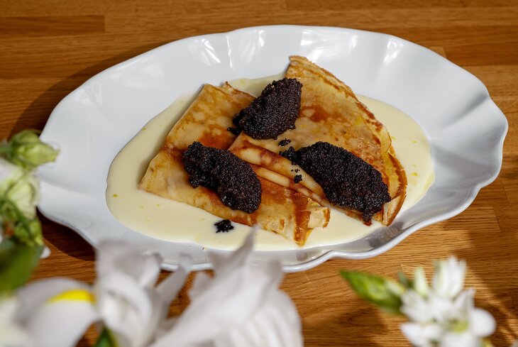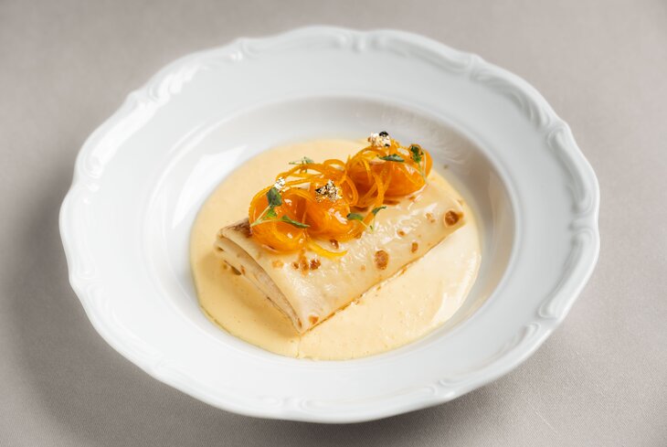 Здесь в блины завернули утку и соус фуа-гра (1 100 рублей). А когда придумывали сладкую версию, вдохновлялись вкусами Сибири — получились блины с мороженым из кефира (950 рублей) и черемуховым вареньем (800 рублей).