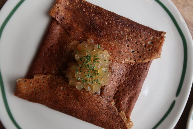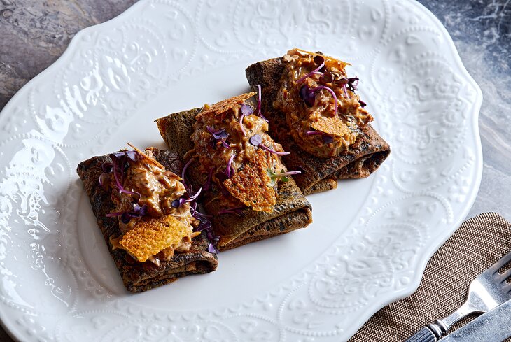 Гречневые блины складывают треугольником и подают с грибной начинкой (1 300 рублей). Еще есть вариант с томленой говядиной и чипсами из топинамбура (1 700 рублей).