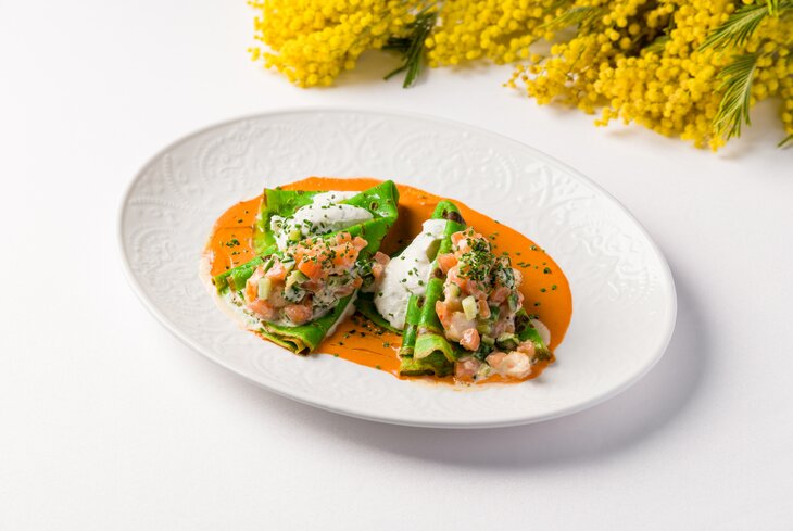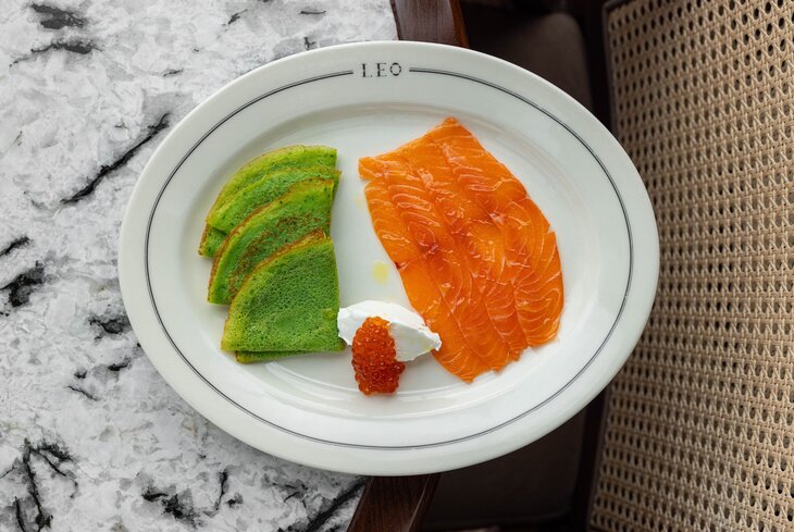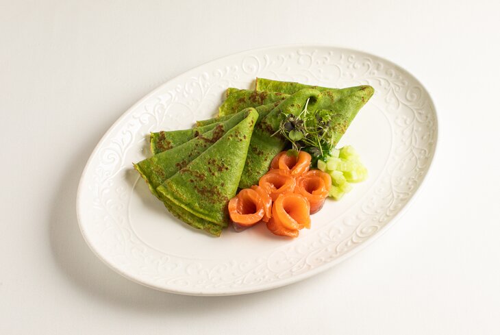 В тесто добавили шпинат — и получились блины насыщенного зеленого цвета с лососем (1 250 рублей). Еще тут готовят морские варианты — с крабом и черной икрой (2 800 рублей), с сибасом (1 600 рублей) и осьминогом (2 600 рублей), а также грибную версию со сморчками (1 450 рублей).