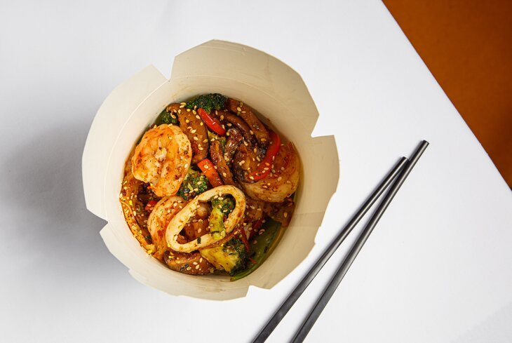 Пожалуй, самое необычное, что тут придумали, — это удон из блинов (1 200 рублей). Приносят в картонной коробочке с креветками, кальмарами и овощами. Еще тут можно заказать сет «Пять морей» (2 250 рублей) — ассорти блинов с разными рыбными начинками: лосось, сибас, тунец, гребешок и красная икра.