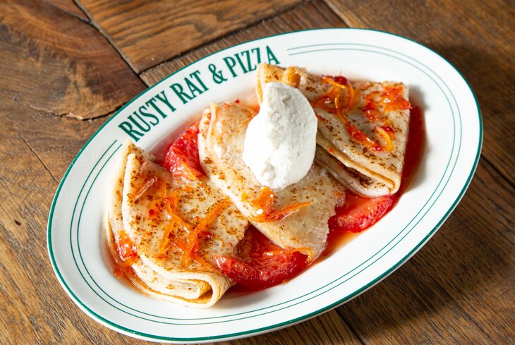 В пиццерии, вдохновленной Нью-Йорком, приготовили яркие соленые варианты — блины с пастрами из лосося и каперсами (1 090 рублей) и панкейки с яйцом и беконом (890 рублей). Еще в числе нетрадиционных вкусов — креп-сюзетт с лимончелло и красными апельсинами (890 рублей).