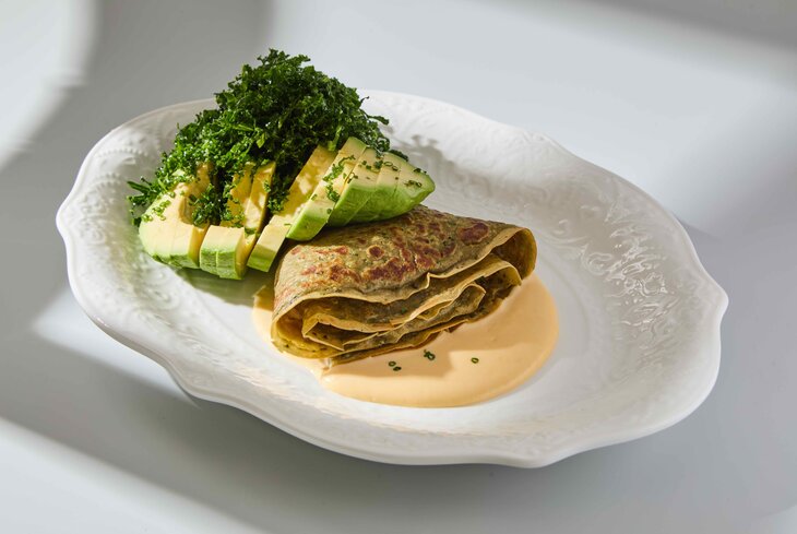 Матча-блин с лососем и авокадо (960 рублей) украшают объемной шапкой из кейла, а еще добавляют сливочный соус. Еще один сытный вариант — с начинкой из фарша из говяжьей вырезки (950 рублей) — дополняют соусом жю и сметаной.