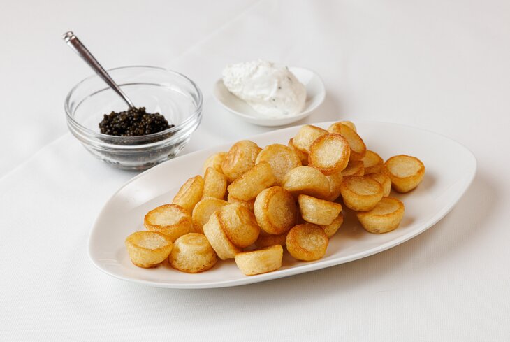 Конечно, традиционные пшеничные блины тут тоже готовят, но есть и изысканный блинный торт со свежей клубникой (1 150 рублей), и креп-сюзетт с абрикосом (2 000 рублей). Самый очаровательный вариант — мини-оладушки с осетровой икрой (2 300 рублей).