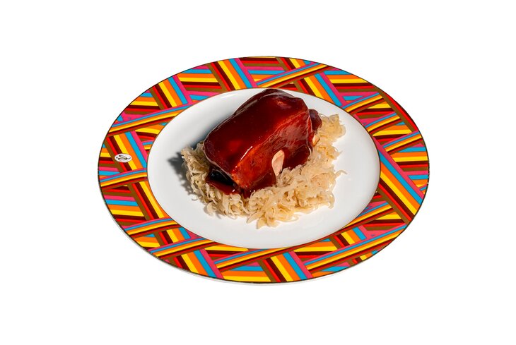 Грудинка томится в кисло-сладком соусе, а затем ее выкладывают на капусту.