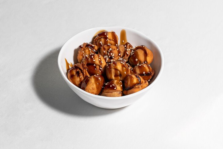 Жареные дамплинги с курицей и сыром под соусом терияки