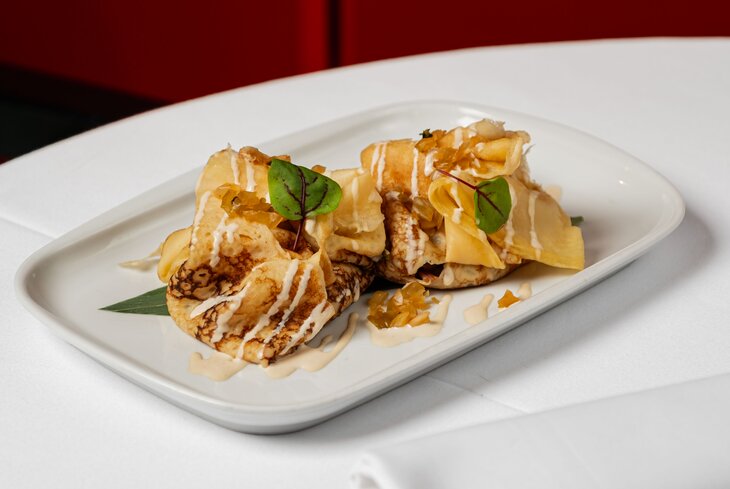 В китайском ресторане шефы соединили классику азиатской кухни с масленичным меню. На выбор — блины с лососем и щавелем (2 400 рублей) или с уткой, маринованной бок-чой и соусом хойсин (1 700 рублей). На десерт приготовили блинный рулет с желе из грейпфрута, крем-чизом и розовым помело (1 100 рублей). Сет можно попробовать до 22 февраля.