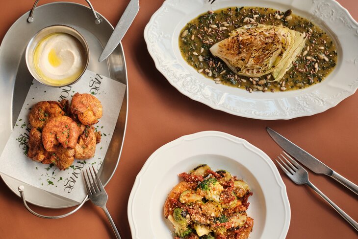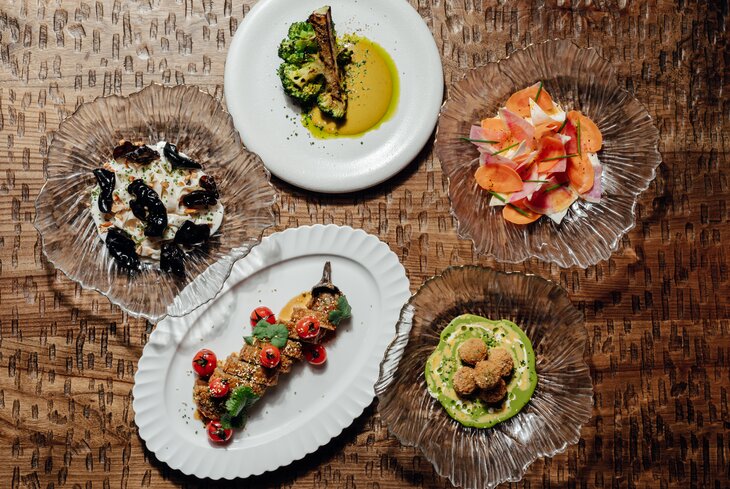 В средиземноморском ресторане готовят печеную свеклу с вишней (900 рублей) и баклажан со сладкими томатами (1 100 рублей). Помимо супа минестроне (1 100 рублей) и грибной похлебки (700 рублей), из основного берите пасту сицилиана (990 рублей) и постные голубцы (1 600 рублей). На десерт — наполеон с клубникой и цедрой лайма (750 рублей).
