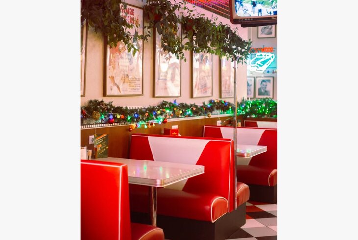 Машина времени, которая переносит в Америку 1950-х с рок-н-ролльными тусовками. Неоновые надписи, красно-белые диваны и бейсбол по телевизору — в общем, все здесь сделали с оглядкой на старые фильмы с Элвисом Пресли. В меню привычные американские сэндвичи с яйцом (525 рублей) и бургеры с беконом (720 рублей) неожиданно соседствуют с шакшукой (525 рублей) и борщом (425 рублей).
