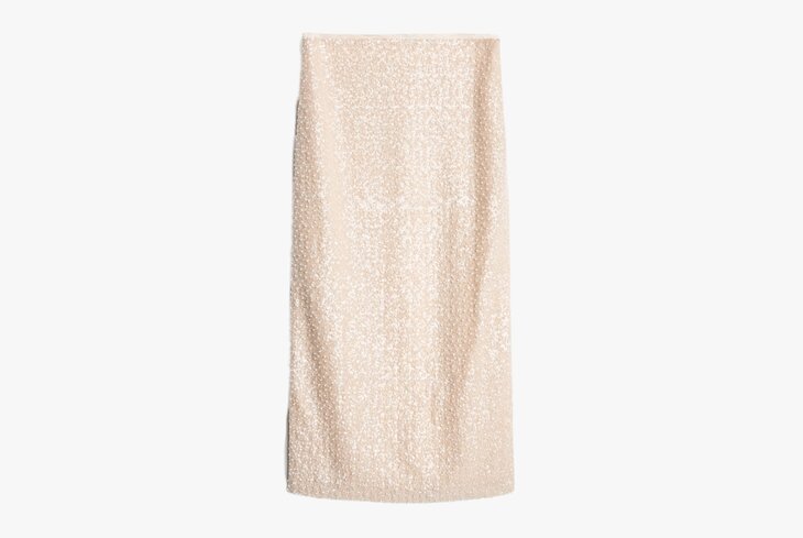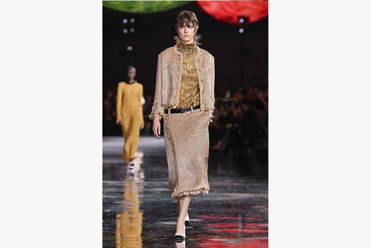 Наряжаться в золото полностью, как модели Chanel, не будем, но и скромничать тоже. Тем более настолько яркие тренды обычно надолго не задерживаются, так что скупать все в золотом цвете не стоит. Как вариант — ограничиться одним нарядным элементом, который позже пригодится для праздничных выходов, например юбкой, обшитой пайетками и жемчугом.