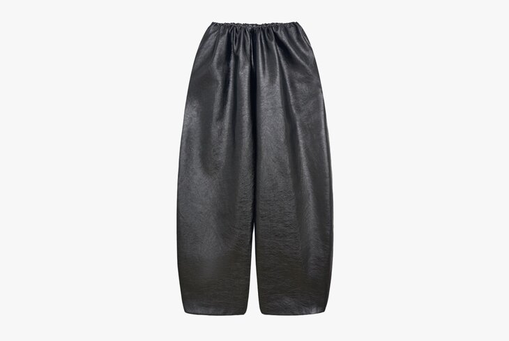 На контрасте с милыми бантами и вязаными элементами в тренде вещи из кожи, особенно глянцевой. Топы, плащ как в «Матрице», сапоги — не важно, что выберете. Но наиболее удобный вариант — брюки как у Acne Studios. Московская погода им не страшна, от брызг легко избавит влажная салфетка.