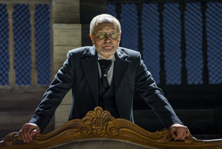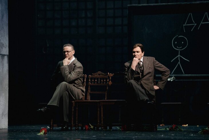 Евгений Герасимов, худрук Театра сатиры, появляется здесь в образе хитрого помощника Чугунова. Спектакль идет более двух с половиной часов и оформлен в контрастных черно-белых декорациях.