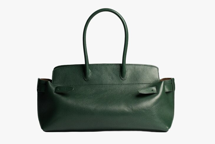 Следующий тоут также подойдет для работы, официальных собраний и классических образов. Актуальная продолговатая форма (напоминает таксу), зернистая кожа, благородный темно-зеленый оттенок и ремешки, с помощью которых можно менять размер сумки. Это базовый минимум!