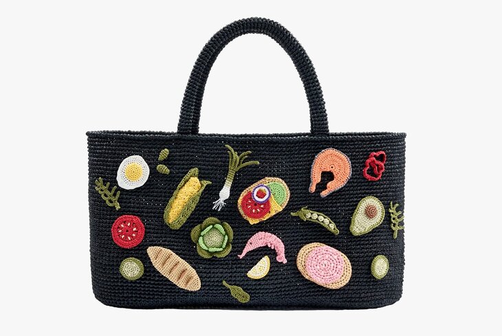 Необязательно ждать лета и у моря погоды, чтобы носить сумку из рафии. Все дело в контрасте фактур: вязаный шопер будет эффектно смотреться с базовым бежевым тренчем. И, само собой, понадобится в жаркий сезон — удобно брать на пляж или носить в городе с топом и джинсами. Осторожно: «съедобная» аппликация вызывает чувство голода.