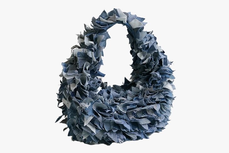 Раз уж зашел разговор об экологии и осознанном потреблении, покажем еще одну находку. Это сумка в форме полумесяца из вторично использованного денима. Выглядит оригинально и легко вписывается в повседневные образы — попробуем замиксовать с джинсовой курткой и бермудами, когда потеплеет.