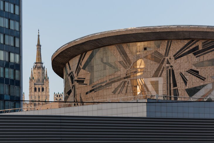 Ансамбль Нового Арбата, идею которого Хрущев подсмотрел в кубинской столице, завершает отошедший теперь к мэрии комплекс зданий Совета экономической взаимопомощи, состоящий из дома-книжки и приземистого цилиндрического конференц-зала. Снаружи и внутри он опоясан абстрактной мозаикой, созданной в 1966-67 годах по эскизам художника Григория Опрышко. Для советского монументального искусства, до тех пор стремившегося к реалистичности, переход к бессюжетным, беспредметным композициям стал настоящей революцией. Лучи, кристаллы, проспекты, свет далеких звезд — каждый увидит в этом сюжете что-то свое, далекое от царивших до тех пор сюжетов с кумачом, серпом, молотом и профилем Ленина.
