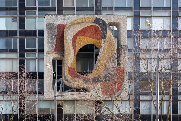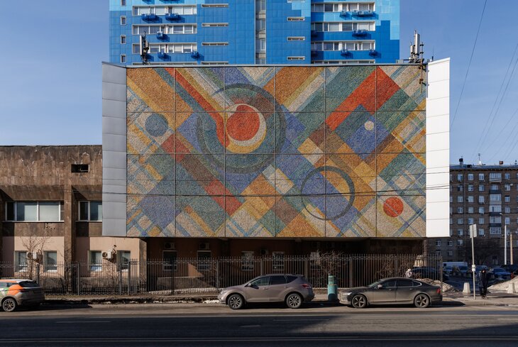 Гимном абстракции в Москве стали два глухих фасада Центрального научно-исследовательского института технологии машиностроения, после того, как в середине 1970-х их украсили мозаиками по эскизам Нинели Мироновой. Сетка разноцветных прямоугольников, поверх которой проходят переливающиеся круги разных размеров, и сегодня выглядят бодро и вполне современно. А в момент открытия эти абстрактные панно высотой в несколько десятков метров сделали фасад технического НИИ одним из самых новаторских в Москве.